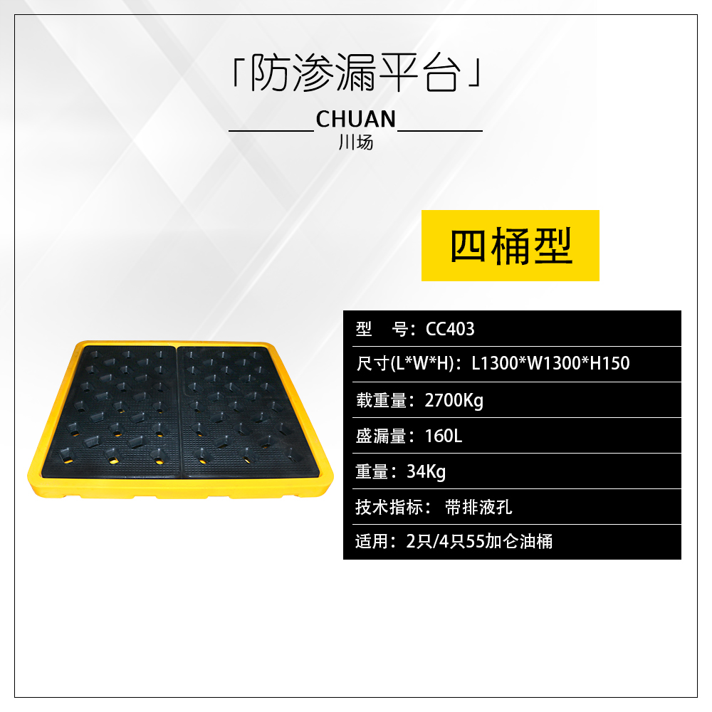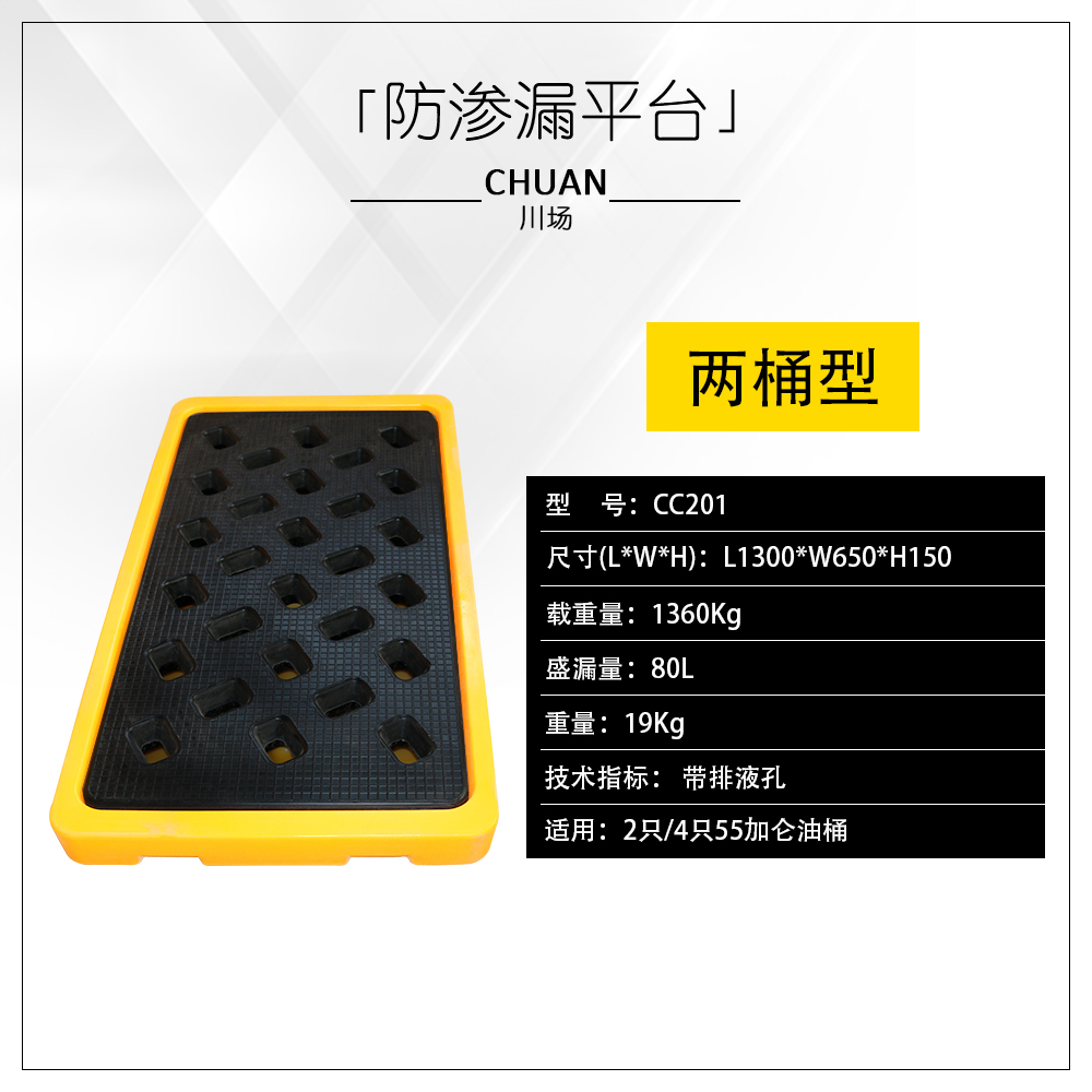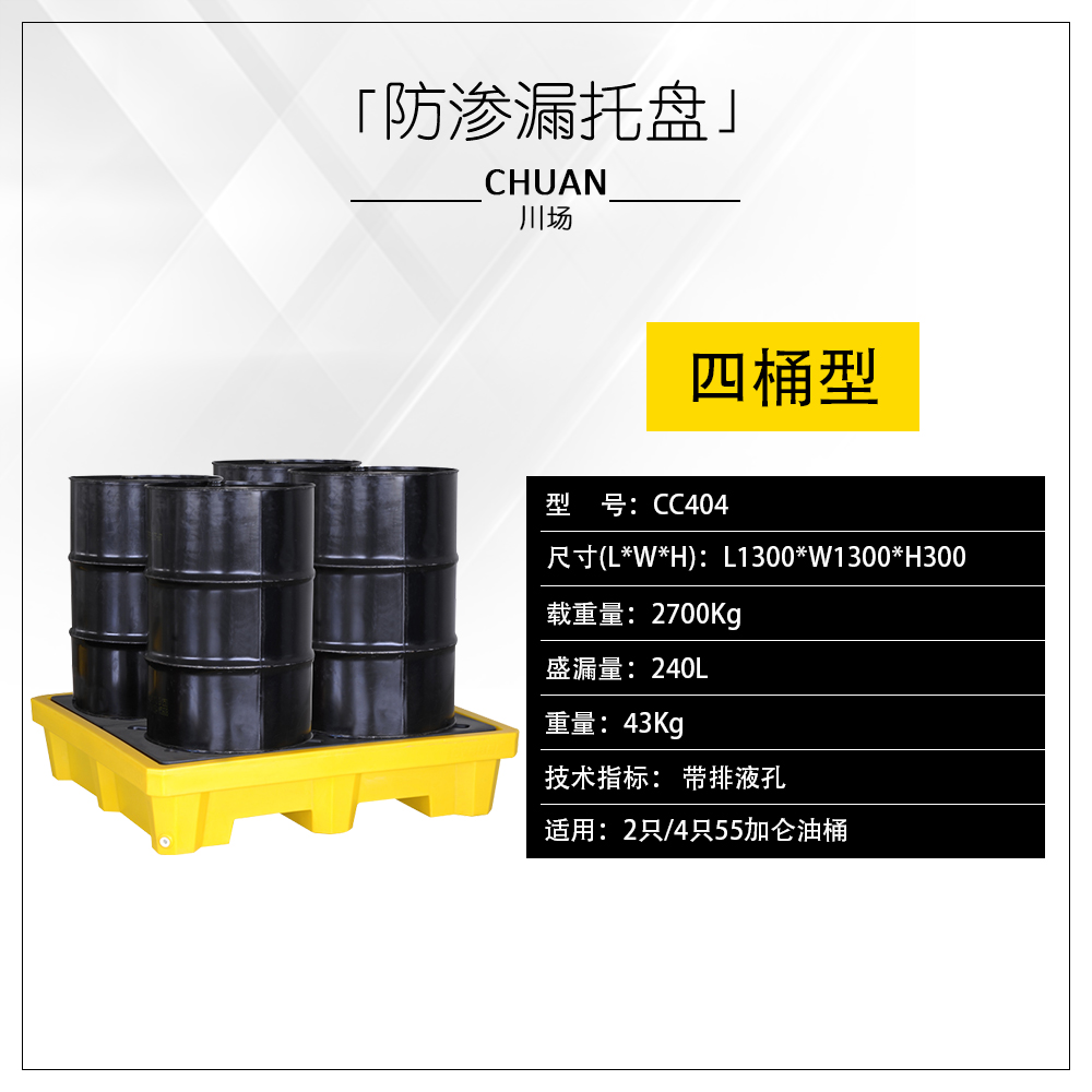 川場提供的盛漏托盤專業用于化學品原料桶的防漏存儲,新型加高設計,儲存的泄漏量更大,尤其適用于腐蝕性化學品的原料倉庫、化學品臨時倉庫進行化學品儲存分裝使用。該系列產品具有以下特性: